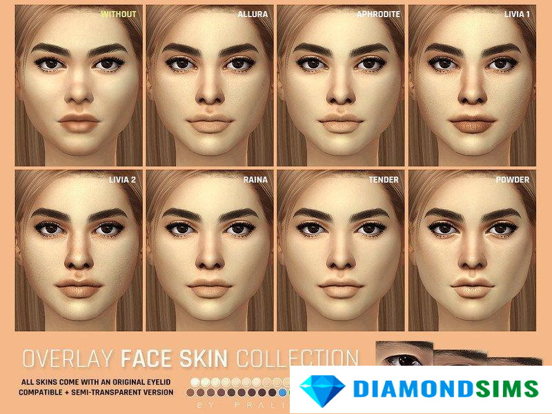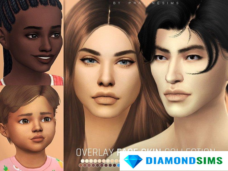 Интересные и уникальные скинтоны для лица. Эти скины отличаются тем, что каждый из них имеет по семь вариаций прорисовки век и губ. Они подходят для любого возраста и наследуются. Также они совместимы с татуировками и работают с hq-модами.