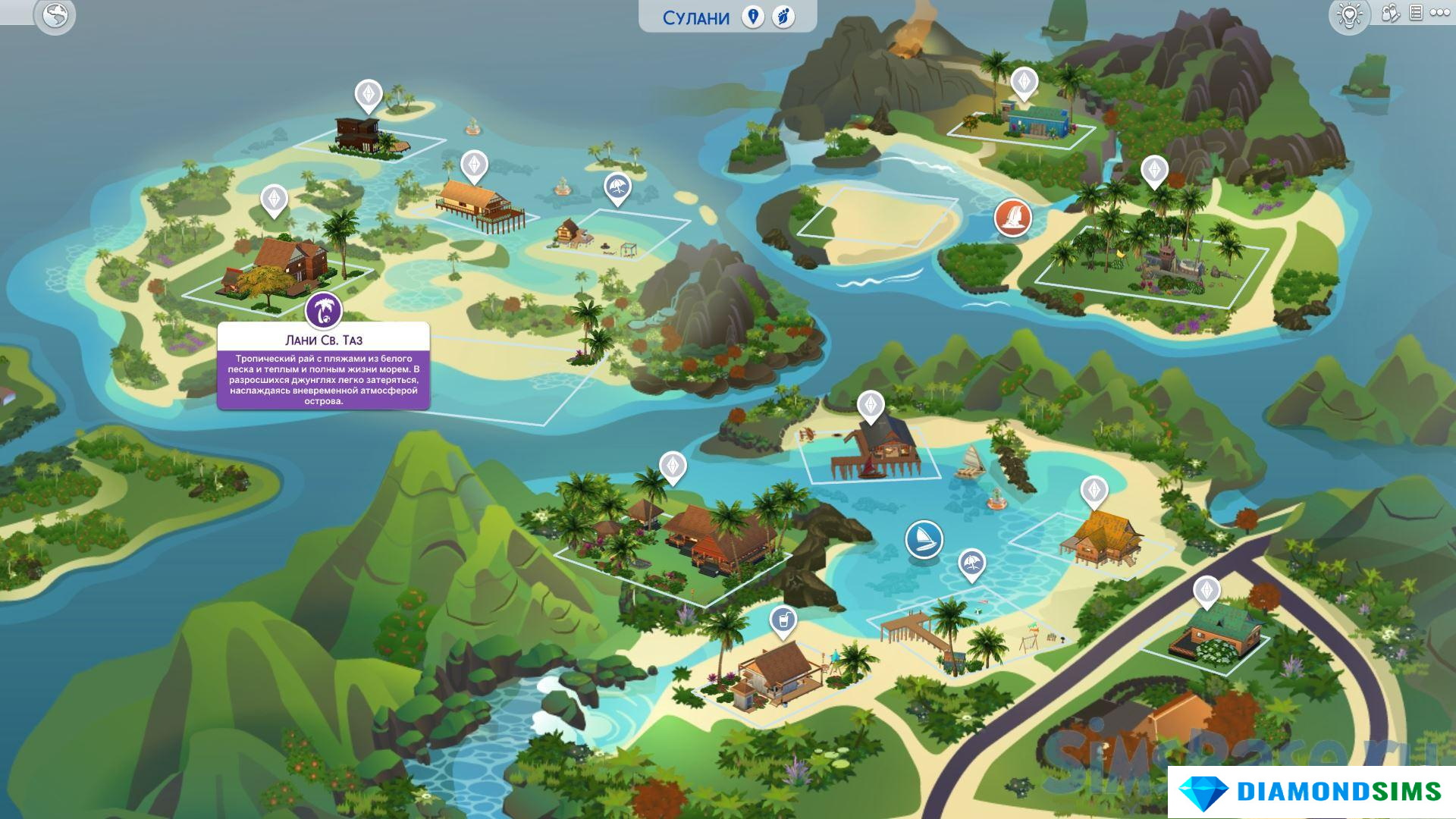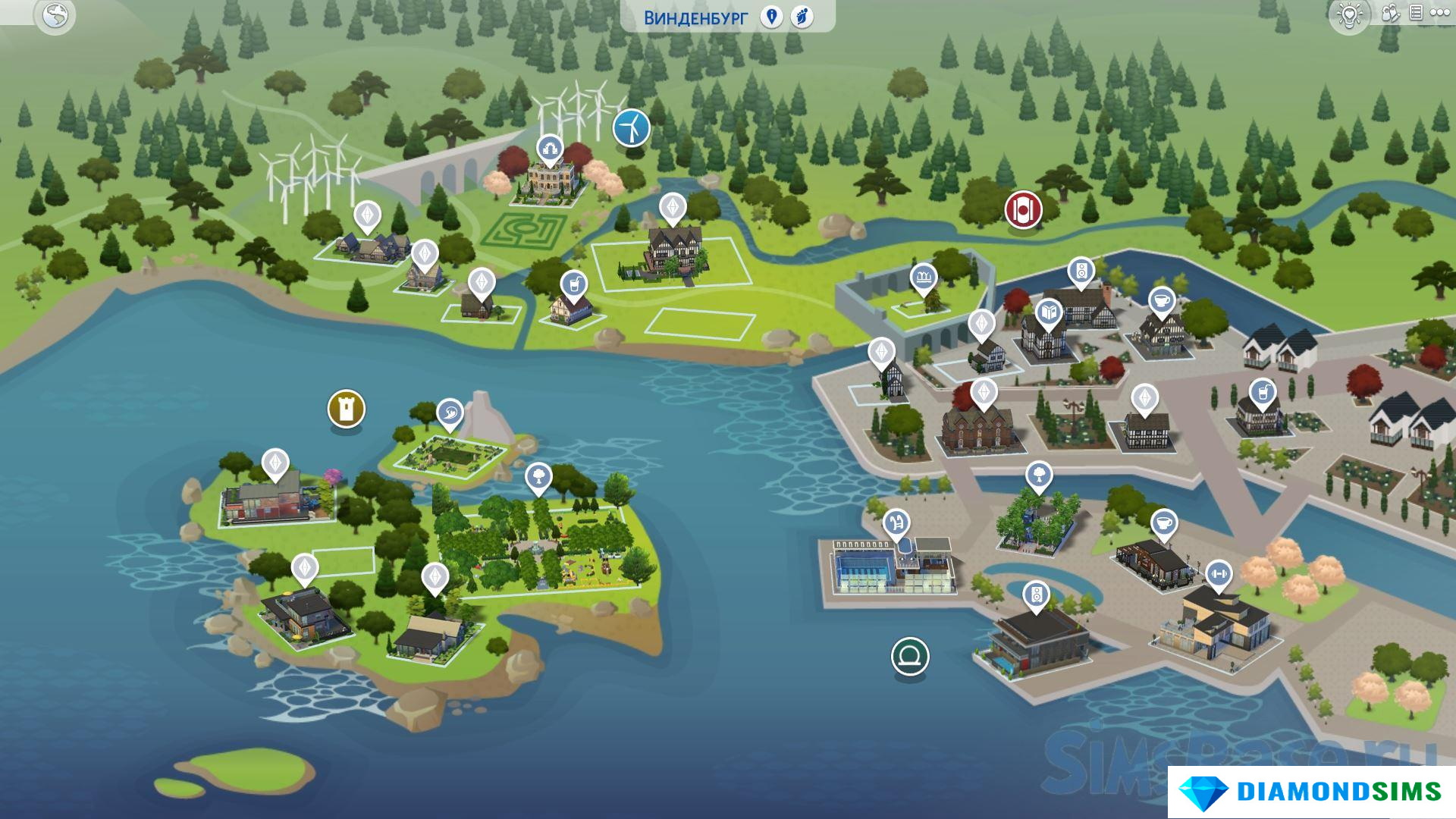 Ага, телефон почти работает, холодильник есть, речка или пруд на острове должны быть. Остров! Значит – Сулани – выбираем и зачищаем от построек всех или остров в Винденбурге тоже можно использовать (главное фантазия). Там тоже 5 участков, которые нужны (см. ниже).