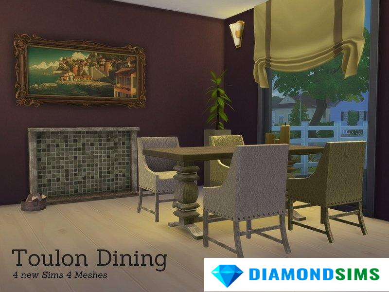 Роскошный набор для создания элегантной столовой в лучших традициях французских и тосканских интерьеров. Включает в себя несколько стульев, драпированных тканью, деревянный стол, а также создающий уют выложенный мозаикой камин и дрова для него.