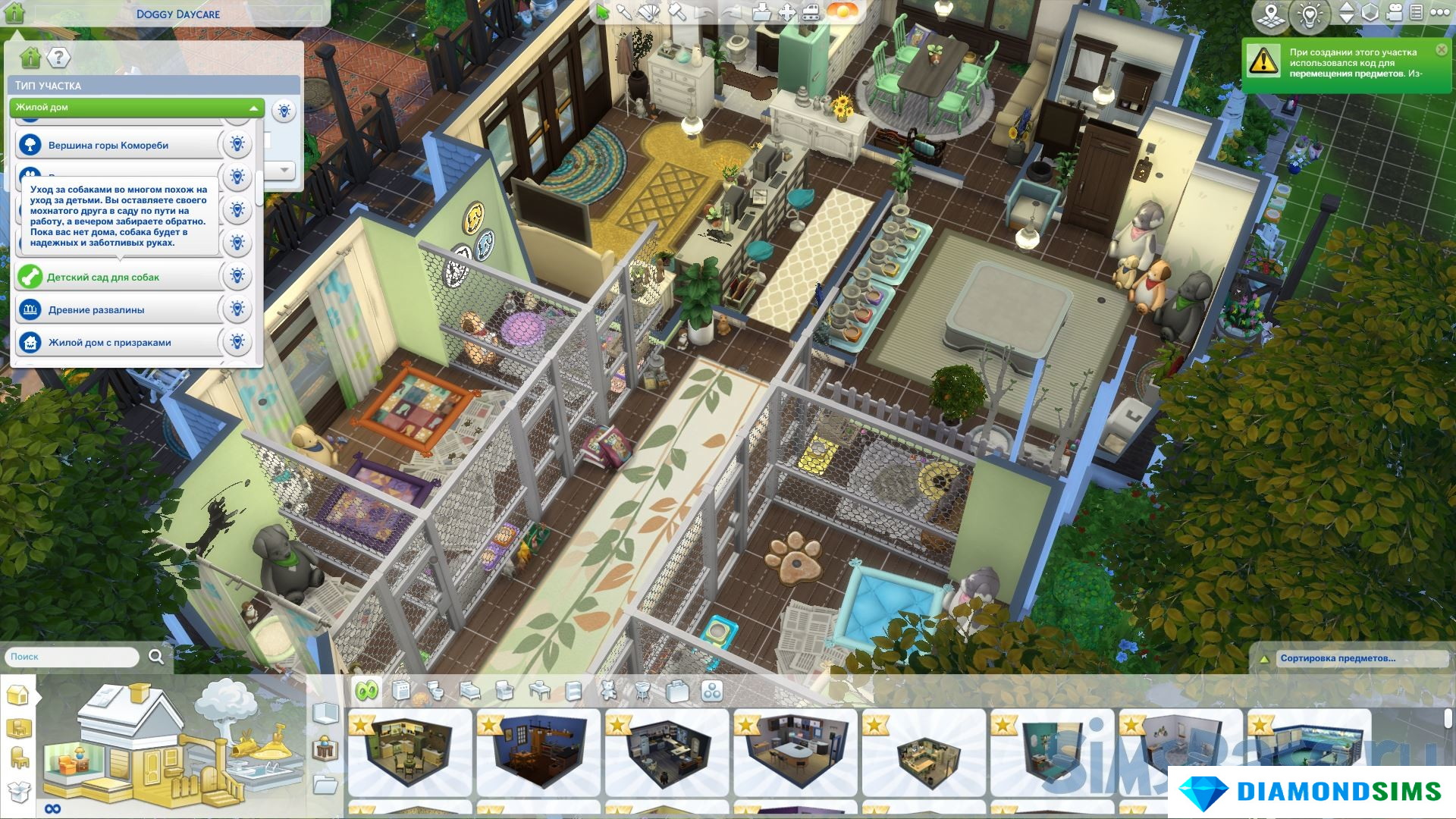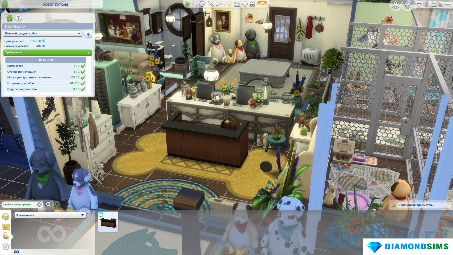 Для начала, вам понадобится создать или скачать участок с детским садом и назначить его типом "Детский сад для собак". Рекомендуется использовать участок от AmyJSims, так как он хорошо выполнен! На участке должны быть стойка регистрации и стол, а также предметы для собак, такие как миски, кровати и игрушки.