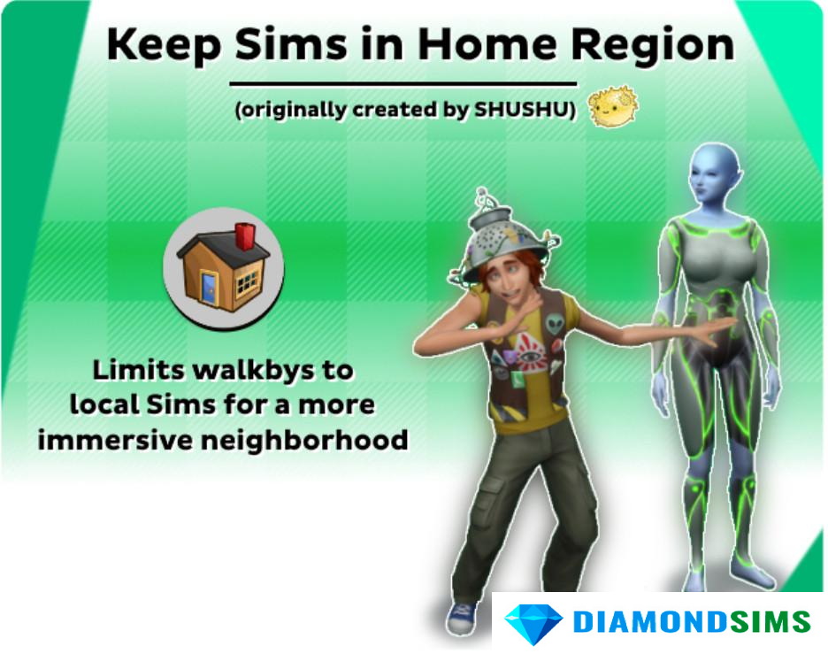 Этот мод позволяет симам появляться только в своем городе на улицах и работать в роли барменов и продавцов. Кроме того, он предоставляет возможность настройки региональных фильтров, учета черт участков и быстрого переселения симов.